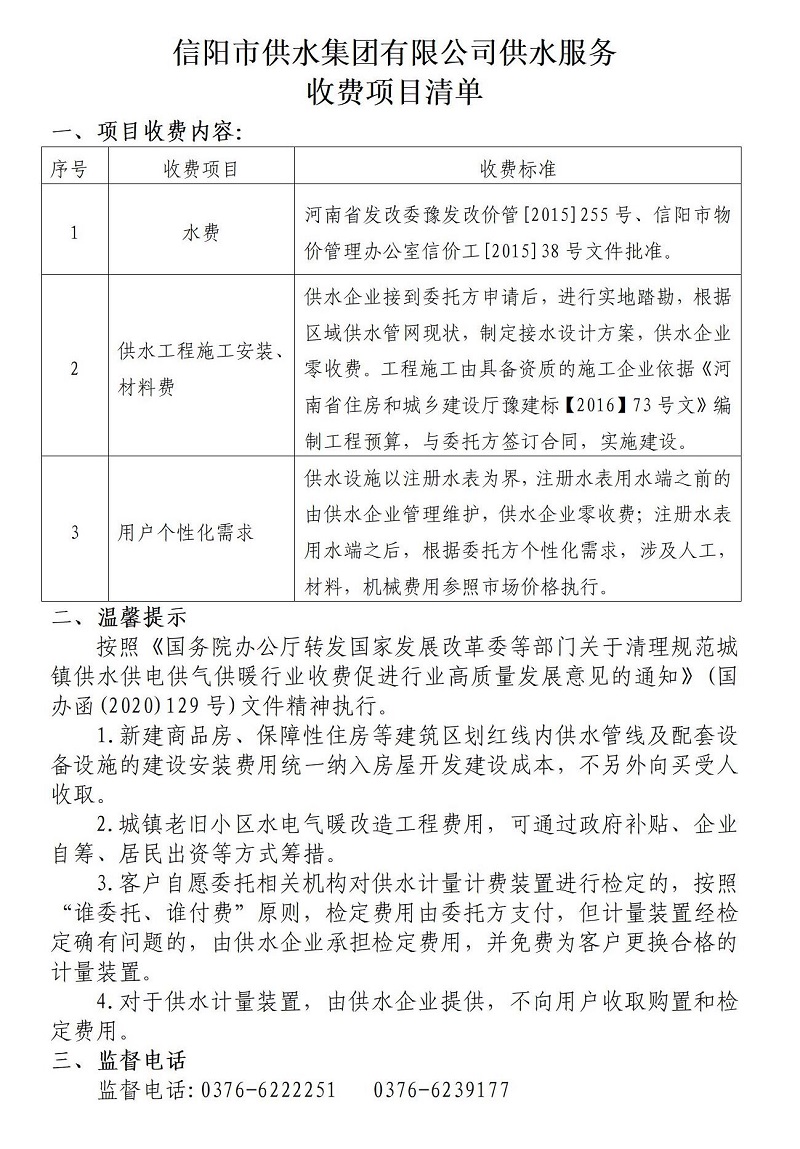 經河南省發改委豫發改價管〔2015〕255號文件、信陽市物價管理辦公室信價工〔2015〕38號文件批準,從2015年4月1日起對市中心城區供水價格進行調整。河南省人民政府豫政〔2017〕44號文件對河南省水資源稅進行了調整,信陽市物價管理辦公室、信陽市財政局、信陽市城市管理局價調〔2018〕27號文件對我市污水處理收費標準進行了調整,具體如下: