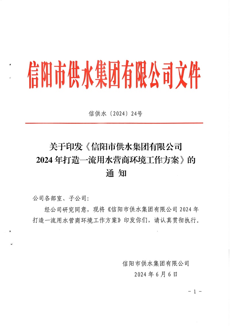 關(guān)于印發(fā)信陽市供水集團有限公司2024年打造一流用水營商環(huán)境工作方案的通知