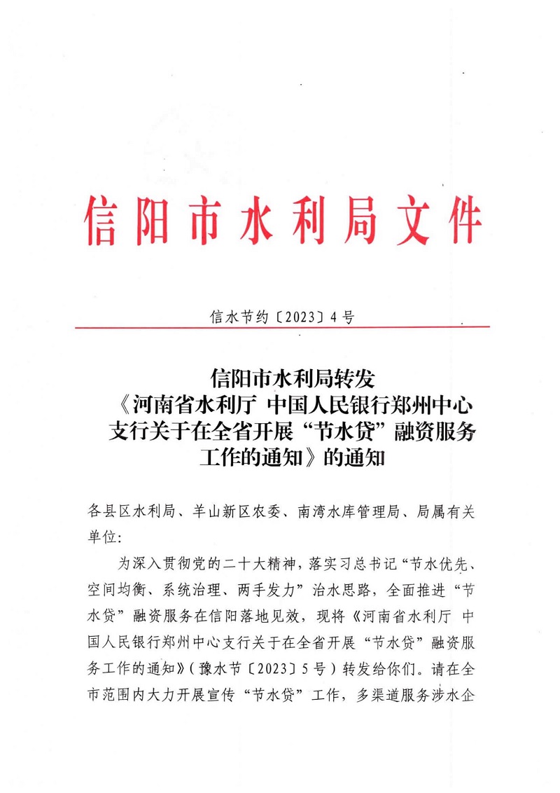 信陽市水利局轉(zhuǎn)發(fā)《河南省水利廳 中國人民銀行鄭州中心支行關(guān)于在全省開展“節(jié)水貸”融資服務(wù)工作的通知》的通知