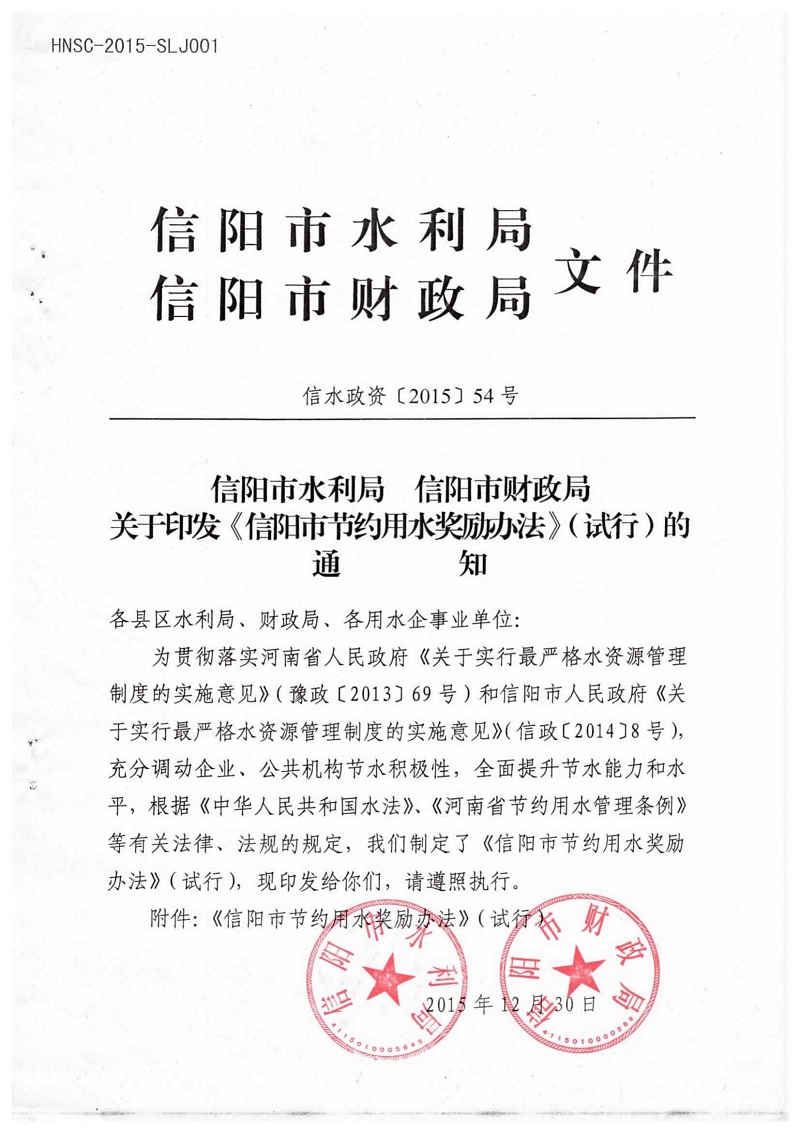 信陽市水利局 信陽市財政局關(guān)于印發(fā)《信陽市節(jié)約用水獎勵辦法》(試行)的通知